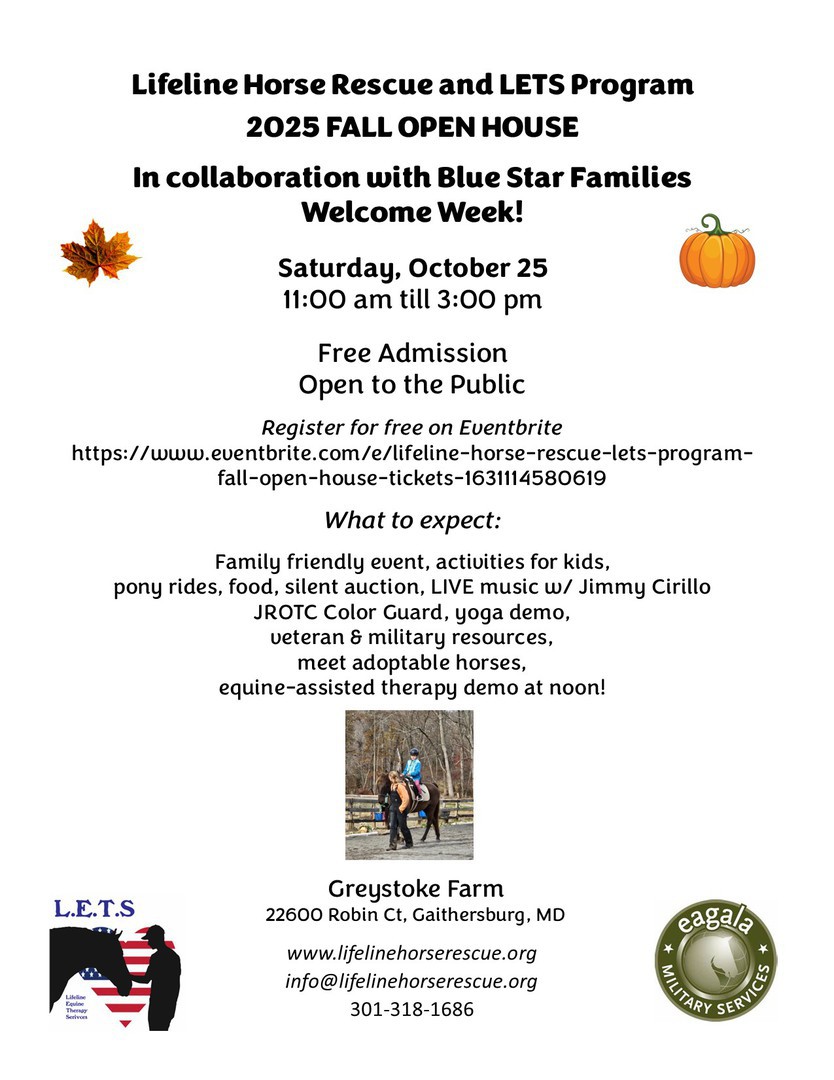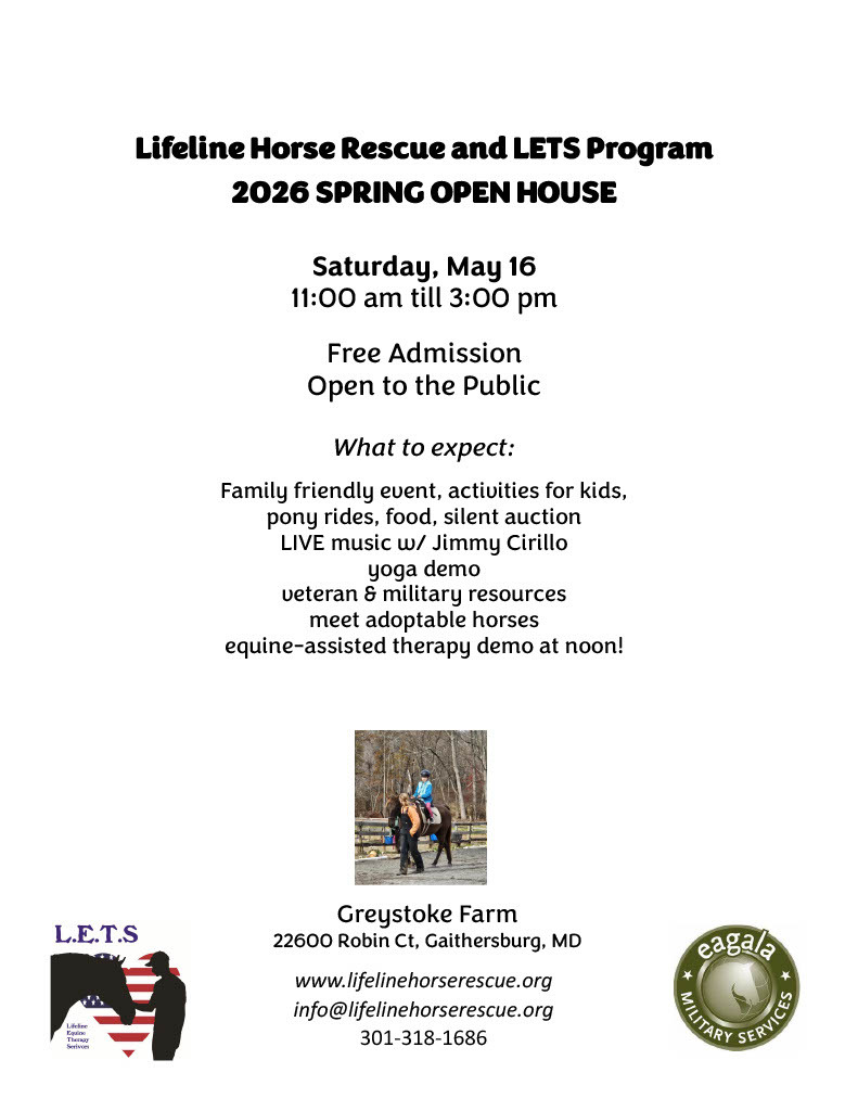 Open House and Eagala Demo for mental health providers, community partners, and military leaders. The Open House will take place on Saturday, March 19 from 12:00 until 1:30 pm in Brookeville, MD. Please contact us for more information and to register for this free event. Email: leila@lifelinehorserescue.org or call 301.318.1686.