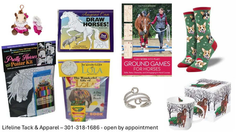 Our tack and apparel shop is located on Greystoke Farm in Gaithersburg, MD. We offer new and gently used items for horse and rider. We have a full range of sizes in new schooling helmets, paddock boots, and tall boots, as well as bits, bridles, halters, show pads, grooming equipment, clippers, and of course treats! Our prices are competitive and all proceeds go directly to helping our rescue horses. Please consider donating clean items in good condition for us to sell and come check us out if you are in need of riding clothes or tack. We are open by appointment.